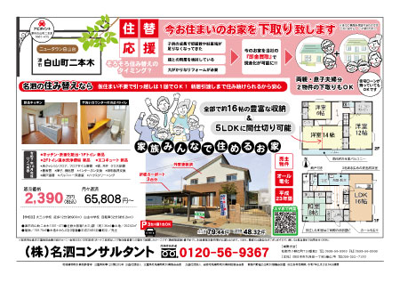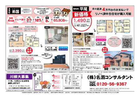 名泗コンサルタントの最新チラシをPDF 形式でご覧いただけます。 チラシ表面 チラシ裏面 2025.11.15 【津方面折込】オススメ物件情報 表面ニュータウン白山台のリノベーション済中古住宅のご紹介! 裏面津市藤方 リノベーション済中古住宅のご紹介! チラシ表面 チラシ裏面 2025.11.15 【多気、小俣方面折込】オススメ物件情報 表面多気町弟国、明和町平尾のリノベーション済中古住宅のご紹介です! 裏面ニュービレッジ明星 期間限定の目玉企画! チラシ表面 チラシ裏面 2025.11.13 『空き家・空き土地』 募集中! 不動産について、元気なうちに考える! 表面意外と困る。残された不動産の行方 子供に残さず、自分の代で完結 裏面ラッピング電車でおなじみの「名泗コンサルタント」です チラシ表面 チラシ裏面 2025.11.8 【津方面折込】オススメ物件情報 表面津市白山町二本木 リノベ済中古住宅のご紹介です! 裏面津市藤方 リノベ完成で新登場!! チラシ表面 チラシ裏面 2025.11.8 【津方面折込】オススメ物件情報 表面津市白山町二本木 リノベ済中古住宅のご紹介です! 裏面松阪市肥留町、津市一志町田尻 リノベ済住宅のご紹介です! チラシ表面 チラシ裏面 2025.11.1 【津方面折込】買取・津市白山町二本木 表面名泗さんにちょっと聞いてみよう 裏面津市白山町二本木 新登場!! 5LDK+P4台をお探しの方へ チラシ表面 チラシ裏面 2025.11.1 【明和町方面折込】多気郡明和町平尾・多気郡明和町明星分譲地 表面多気郡明和町平尾のオススメ物件情報です! 裏面ニュービレッジ明星 完成記念 期間限定目玉企画! チラシ表面 チラシ裏面 2025.11.1 チラシ初登場!いなべ市員弁町御薗・内覧会開催します 表面チラシ初登場!いなべ市員弁町御薗 11月1日(土)、2日(日) 12:00~16:00内覧会開催します 裏面伊坂台二丁目・高見台一丁目 内覧随時受付中です チラシ表面 チラシ裏面 2024.11.30 買取新聞 11月23日号、11月30日号 表面買取?仲介? 不動産売却 後悔しない選択を。 裏面広告掲載期間終了しました チラシ表面 チラシ裏面 2024.9.28 買取新聞 9月28日号 表面親の遺産。進まない遺産分割。家族間でトラブル発生!? 裏面広告掲載期間終了しました 123次の10件 >
