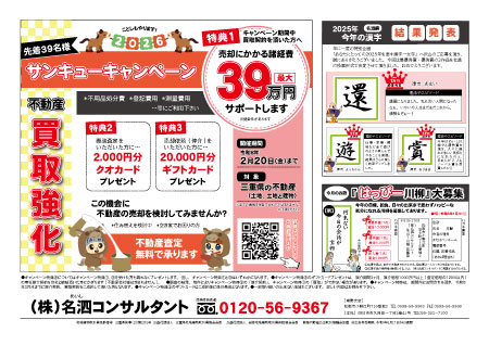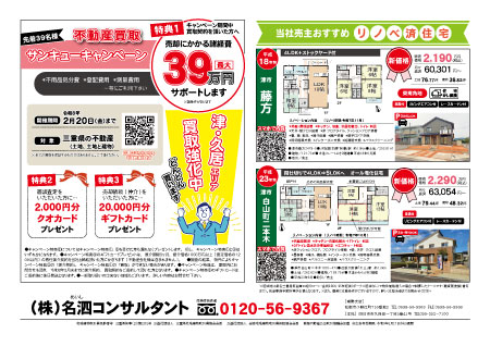 名泗コンサルタントの最新チラシをPDF 形式でご覧いただけます。 チラシ表面 チラシ裏面 2026.1.22 不動産買取★サンキューキャンペーン 開催中 表面不動産買取強化! サンキューキャンペーン開催中です 裏面ラッピング電車でおなじみの「名泗コンサルタント」です チラシ表面 チラシ裏面 2026.1.17 【伊賀、名張方面折込】サンキューキャンペーン・オススメ物件情報 表面サンキューキャンペーン始まってます! 裏面伊賀市桐ケ丘5丁目、名張市梅が丘南三番町 は名泗コンサルタントオススメのリノベ済住宅です チラシ表面 チラシ裏面 2026.1.17 【久居方面折込】サンキューキャンペーン・オススメ物件情報 表面津市藤方 津市白山町二本木 は名泗コンサルタントオススメのリノベ済住宅です 裏面津市久居持川町 まもなくリノベ完成で新登場! チラシ表面 チラシ裏面 2026.1.10 名泗コンサルタント★お勧め物件情報★ 表面お勧め物件情報 戸建・マンション 裏面お勧め物件情報 戸建・土地・その他 チラシ表面 チラシ裏面 2024.11.30 買取新聞 11月23日号、11月30日号 表面買取?仲介? 不動産売却 後悔しない選択を。 裏面広告掲載期間終了しました チラシ表面 チラシ裏面 2024.9.28 買取新聞 9月28日号 表面親の遺産。進まない遺産分割。家族間でトラブル発生!? 裏面広告掲載期間終了しました チラシ表面 チラシ裏面 2024.7.20 買取新聞 7月20日号 表面もめるのは嫌!相続登記 再確認でトラブル回避! 裏面広告掲載期間終了しました チラシ表面 チラシ裏面 2024.4.20 買取新聞 4月20日号 表面空き家放置が機会損失に繋がるワケとは? 裏面広告掲載期間終了しました チラシ表面 チラシ裏面 2024.3.30 買取新聞 3月30日号 表面お父さん、お母さん 不(負)動産は残さないで・・・ 裏面広告掲載期間終了しました チラシ表面 チラシ裏面 2024.3.2 買取新聞 3月2日号 表面まさか自分に!? 近年急増 「突然相続」の知らせとは? 裏面広告掲載期間終了しました 123次の10件 >