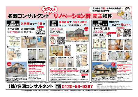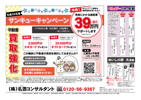 名泗コンサルタントの最新チラシをPDF 形式でご覧いただけます。 チラシ表面 チラシ裏面 2026.2.12 不動産買取★サンキューキャンペーン 開催中 表面不動産買取強化! サンキューキャンペーン開催中です 裏面ラッピング電車でおなじみの「名泗コンサルタント」です チラシ表面 チラシ裏面 2026.2.10 【津方面折込】サンキューキャンペーン・オススメ物件情報 表面サンキューキャンペーン開催中! 裏面津市でオススメのリノベ済 売主物件のご紹介です! チラシ表面 チラシ裏面 2026.1.31 【伊勢方面折込】サンキューキャンペーン・オススメ物件情報 表面ニュービレッジ明星 好評分譲中です! 裏面伊勢市船江四丁目 リノベまもなく完成で新登場です! チラシ表面 チラシ裏面 2026.1.31 【津方面折込】サンキューキャンペーン・オススメ物件情報 表面サンキューキャンペーン開催中です! 裏面名泗コンサルタント オススメの『リノベ済中古住宅』のご紹介です! チラシ表面 チラシ裏面 2026.1.24 【津方面折込】サンキューキャンペーン・津市久居持川町 表面サンキューキャンペーン開催中です! 裏面お待たせしました!津市久居持川町 リノベ済 オール電化住宅が新登場! チラシ表面 チラシ裏面 2026.1.24 【津市方面折込】サンキューキャンペーン・オススメ物件情報 表面サンキューキャンペーン開催中です! 裏面津市白山町二本木・津市藤方 オススメのリノベ済中古住宅 チラシ表面 チラシ裏面 2024.11.30 買取新聞 11月23日号、11月30日号 表面買取?仲介? 不動産売却 後悔しない選択を。 裏面広告掲載期間終了しました チラシ表面 チラシ裏面 2024.9.28 買取新聞 9月28日号 表面親の遺産。進まない遺産分割。家族間でトラブル発生!? 裏面広告掲載期間終了しました チラシ表面 チラシ裏面 2024.7.20 買取新聞 7月20日号 表面もめるのは嫌!相続登記 再確認でトラブル回避! 裏面広告掲載期間終了しました チラシ表面 チラシ裏面 2024.4.20 買取新聞 4月20日号 表面空き家放置が機会損失に繋がるワケとは? 裏面広告掲載期間終了しました 123次の10件 >