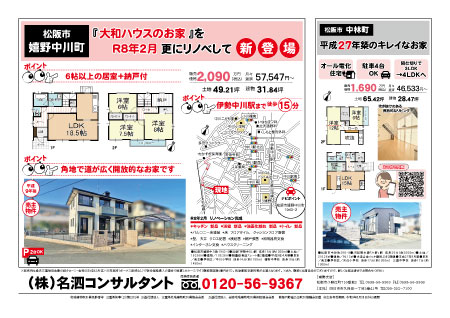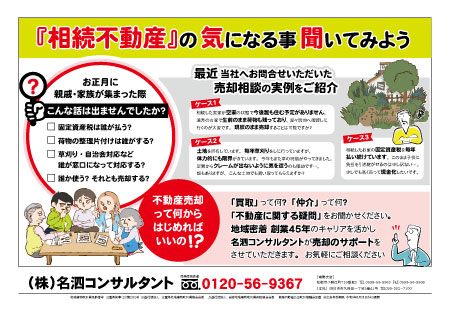 名泗コンサルタントの最新チラシをPDF 形式でご覧いただけます。 チラシ表面 チラシ裏面 2026.2.28 【松阪方面折込】買取・オススメ物件情報 表面『相続不動産』の気になる事聞いてみよう 裏面松阪市嬉野中川町 リノベ済住宅 新登場! チラシ表面 チラシ裏面 2026.2.26 登記が残っていませんか? 表面ご存じですか? 令和6年4月から相続登記が義務化されています 裏面ラッピング電車でおなじみの 名泗コンサルタントです! チラシ表面 チラシ裏面 2026.2.20 【伊賀、名張方面折込】買取・オススメ物件情報 表面『相続不動産』の気になる事聞いてみよう 裏面伊賀市桐ケ丘六丁目 リノベ済住宅 新登場! チラシ表面 チラシ裏面 2026.2.19 令和6年4月から相続登記が義務化されています 表面ラッピング電車でおなじみの「名泗コンサルタント」です 裏面売却したいけど相続問題でお悩みの方、相続問題で悩む前に解決したい方 まずはお気軽にご相談ください チラシ表面 チラシ裏面 2026.2.10 【津方面折込】サンキューキャンペーン・オススメ物件情報 表面サンキューキャンペーン開催中! 裏面津市でオススメのリノベ済 売主物件のご紹介です! チラシ表面 チラシ裏面 2024.11.30 買取新聞 11月23日号、11月30日号 表面買取?仲介? 不動産売却 後悔しない選択を。 裏面広告掲載期間終了しました チラシ表面 チラシ裏面 2024.9.28 買取新聞 9月28日号 表面親の遺産。進まない遺産分割。家族間でトラブル発生!? 裏面広告掲載期間終了しました チラシ表面 チラシ裏面 2024.7.20 買取新聞 7月20日号 表面もめるのは嫌!相続登記 再確認でトラブル回避! 裏面広告掲載期間終了しました チラシ表面 チラシ裏面 2024.4.20 買取新聞 4月20日号 表面空き家放置が機会損失に繋がるワケとは? 裏面広告掲載期間終了しました チラシ表面 チラシ裏面 2024.3.30 買取新聞 3月30日号 表面お父さん、お母さん 不(負)動産は残さないで・・・ 裏面広告掲載期間終了しました 123次の10件 >