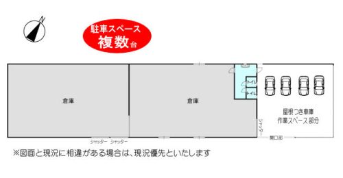 | 建物構造/建物階数 | 鉄骨造亜鉛メッキ鋼板葺平家建 | 建物面積 | 373.47㎡(112.97坪) |
