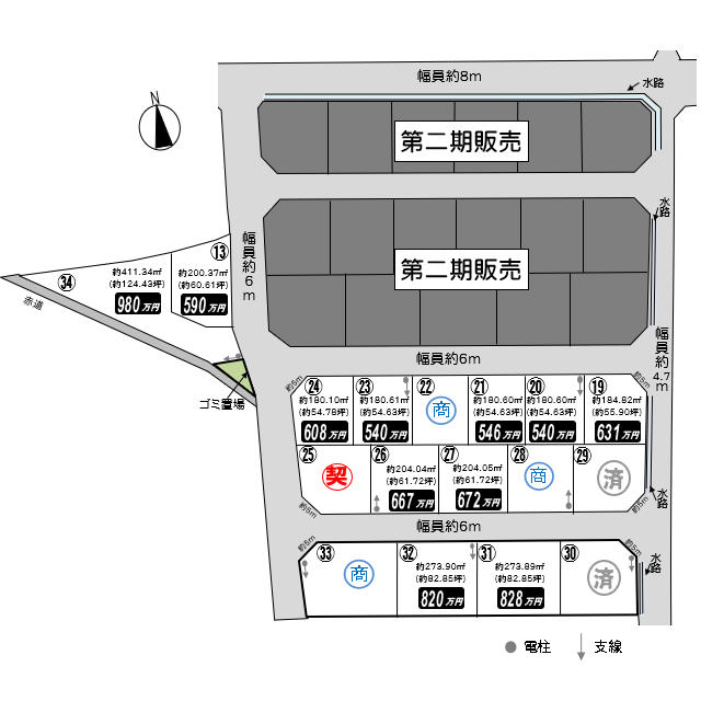 | 34号地 | 約411.34㎡(約124.43坪) | 980万円 | 坪単価約7.9万円 |