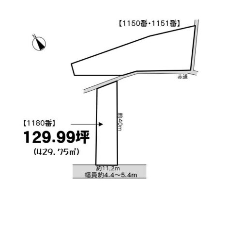 接道状況 | 1180番南西側:幅員約4.4~5.4m 1151番南西側及び南東側:赤道 |