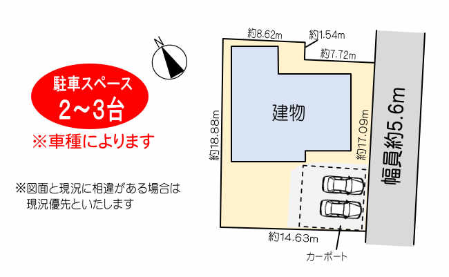 | 駐車場 | 2~3台 ※カーポートあり | 現況 | リフォーム完了 2025年10月 |
