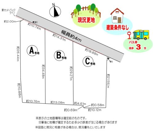| 接道状況 | 北側幅員約4.0m ※一部4m未満の箇所については、セットバックが必要になります |