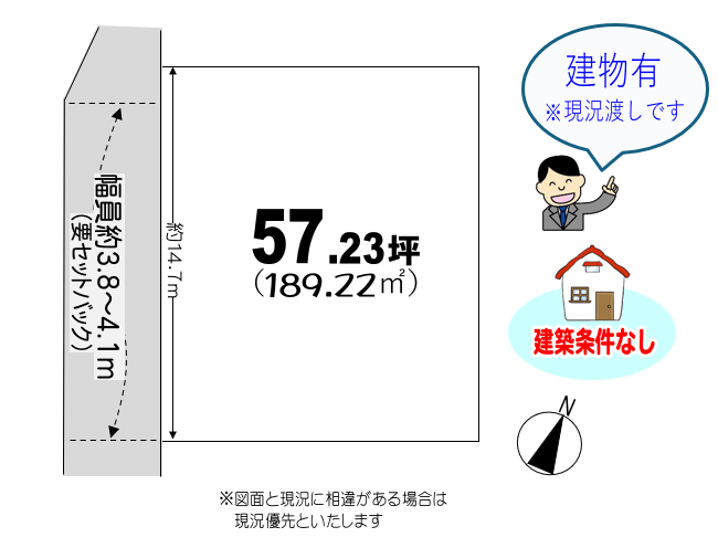 | 現況 | 上物あり | 引渡条件 | ※建物あり・現況渡し(境界:非明示)(契約不適合責任:免責) |