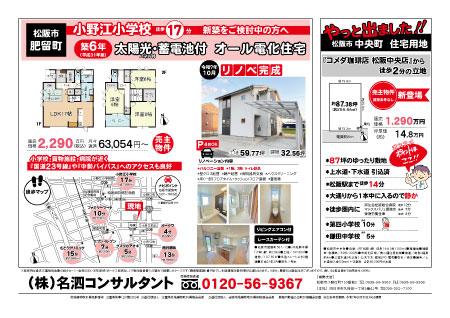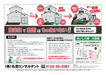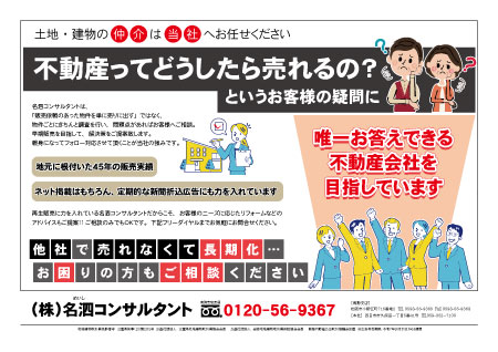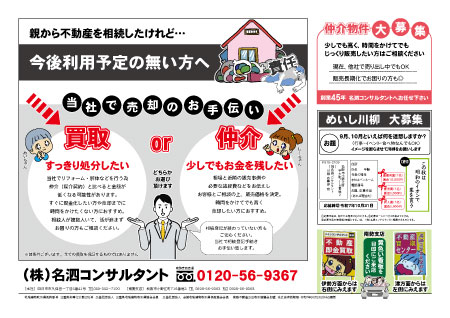 名泗コンサルタントの最新チラシをPDF 形式でご覧いただけます。 チラシ表面 チラシ裏面 2025.10.25 【松阪方面へ折込】仲介・オススメ物件情報 表面不動産ってどうしたら売れるの?というお客様の疑問に 裏面松阪市肥留町、松阪市中央町のオススメ物件情報です チラシ表面 チラシ裏面 2025.10.23 空家・空地でお困りごとはございませんか? 表面こんな時はだれに相談すればいいの? 名泗コンサルタントにご相談ください! 裏面地域密着!現金買取! 不動産を売るなら名泗コンサルタントへお任せください チラシ表面 チラシ裏面 2025.10.18 【津、松阪方面折込】買取チラシ・オススメ物件情報 表面空き家で放置はもったいない!! 裏面松阪市肥留町 リノベ住宅 新登場! チラシ表面 チラシ裏面 2025.10.18 【多気、小俣方面折込】買取チラシ・オススメ物件情報 表面親から不動産を相続したけれど…今後利用の無い方へ 裏面多気町弟国 築3年リノベ済住宅・明和町明星 全34区画の分譲地・伊勢市曽祢二丁目 店舗付住宅のご紹介 チラシ表面 チラシ裏面 2024.11.30 買取新聞 11月23日号、11月30日号 表面買取?仲介? 不動産売却 後悔しない選択を。 裏面広告掲載期間終了しました チラシ表面 チラシ裏面 2024.9.28 買取新聞 9月28日号 表面親の遺産。進まない遺産分割。家族間でトラブル発生!? 裏面広告掲載期間終了しました チラシ表面 チラシ裏面 2024.7.20 買取新聞 7月20日号 表面もめるのは嫌!相続登記 再確認でトラブル回避! 裏面広告掲載期間終了しました チラシ表面 チラシ裏面 2024.4.20 買取新聞 4月20日号 表面空き家放置が機会損失に繋がるワケとは? 裏面広告掲載期間終了しました チラシ表面 チラシ裏面 2024.3.30 買取新聞 3月30日号 表面お父さん、お母さん 不(負)動産は残さないで・・・ 裏面広告掲載期間終了しました チラシ表面 チラシ裏面 2024.3.2 買取新聞 3月2日号 表面まさか自分に!? 近年急増 「突然相続」の知らせとは? 裏面広告掲載期間終了しました 123次の10件 >