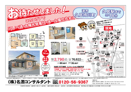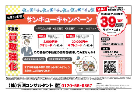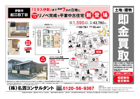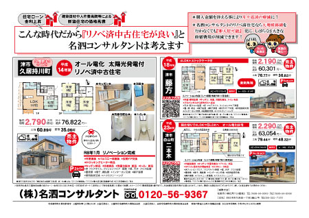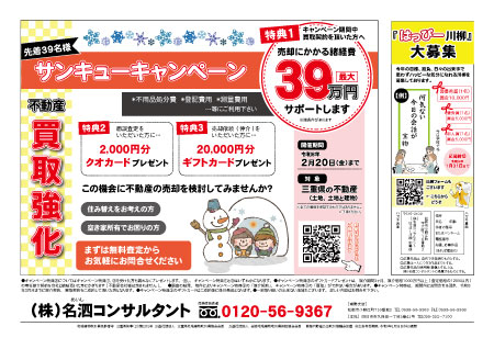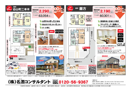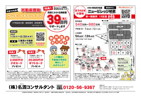 名泗コンサルタントの最新チラシをPDF 形式でご覧いただけます。 チラシ表面 チラシ裏面 2026.1.31 【伊勢方面折込】サンキューキャンペーン・オススメ物件情報 表面ニュービレッジ明星 好評分譲中です! 裏面伊勢市船江四丁目 リノベまもなく完成で新登場です! チラシ表面 チラシ裏面 2026.1.31 【津方面折込】サンキューキャンペーン・オススメ物件情報 表面サンキューキャンペーン開催中です! 裏面名泗コンサルタント オススメの『リノベ済中古住宅』のご紹介です! チラシ表面 チラシ裏面 2026.1.29 不動産買取★サンキューキャンペーン 開催中 表面不動産買取強化! サンキューキャンペーン開催中です 裏面ラッピング電車でおなじみの「名泗コンサルタント」です チラシ表面 チラシ裏面 2026.1.24 【津方面折込】サンキューキャンペーン・津市久居持川町 表面サンキューキャンペーン開催中です! 裏面お待たせしました!津市久居持川町 リノベ済 オール電化住宅が新登場! チラシ表面 チラシ裏面 2026.1.24 【津市方面折込】サンキューキャンペーン・オススメ物件情報 表面サンキューキャンペーン開催中です! 裏面津市白山町二本木・津市藤方 オススメのリノベ済中古住宅 チラシ表面 チラシ裏面 2026.1.17 【伊賀、名張方面折込】サンキューキャンペーン・オススメ物件情報 表面サンキューキャンペーン始まってます! 裏面伊賀市桐ケ丘5丁目、名張市梅が丘南三番町 は名泗コンサルタントオススメのリノベ済住宅です チラシ表面 チラシ裏面 2026.1.17 【久居方面折込】サンキューキャンペーン・オススメ物件情報 表面津市藤方 津市白山町二本木 は名泗コンサルタントオススメのリノベ済住宅です 裏面津市久居持川町 まもなくリノベ完成で新登場! チラシ表面 チラシ裏面 2026.1.10 名泗コンサルタント★お勧め物件情報★ 表面お勧め物件情報 戸建・マンション 裏面お勧め物件情報 戸建・土地・その他 チラシ表面 チラシ裏面 2024.11.30 買取新聞 11月23日号、11月30日号 表面買取?仲介? 不動産売却 後悔しない選択を。 裏面広告掲載期間終了しました チラシ表面 チラシ裏面 2024.9.28 買取新聞 9月28日号 表面親の遺産。進まない遺産分割。家族間でトラブル発生!? 裏面広告掲載期間終了しました 123次の10件 >