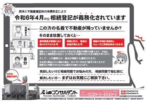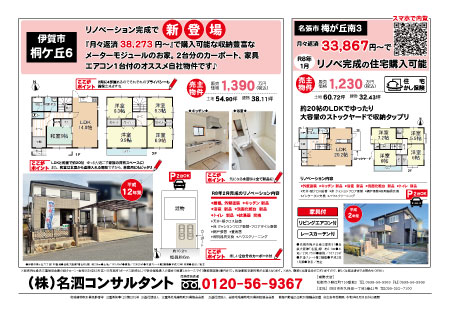 名泗コンサルタントの最新チラシをPDF 形式でご覧いただけます。 チラシ表面 チラシ裏面 2026.2.20 【伊賀、名張方面折込】買取・オススメ物件情報 表面『相続不動産』の気になる事聞いてみよう 裏面伊賀市桐ケ丘六丁目 リノベ済住宅 新登場! チラシ表面 チラシ裏面 2026.2.19 令和6年4月から相続登記が義務化されています 表面ラッピング電車でおなじみの「名泗コンサルタント」です 裏面売却したいけど相続問題でお悩みの方、相続問題で悩む前に解決したい方 まずはお気軽にご相談ください チラシ表面 チラシ裏面 2026.2.12 不動産買取★サンキューキャンペーン 開催中 表面不動産買取強化! サンキューキャンペーン開催中です 裏面ラッピング電車でおなじみの「名泗コンサルタント」です チラシ表面 チラシ裏面 2026.2.10 【津方面折込】サンキューキャンペーン・オススメ物件情報 表面サンキューキャンペーン開催中! 裏面津市でオススメのリノベ済 売主物件のご紹介です! チラシ表面 チラシ裏面 2026.1.31 【伊勢方面折込】サンキューキャンペーン・オススメ物件情報 表面ニュービレッジ明星 好評分譲中です! 裏面伊勢市船江四丁目 リノベまもなく完成で新登場です! チラシ表面 チラシ裏面 2026.1.31 【津方面折込】サンキューキャンペーン・オススメ物件情報 表面サンキューキャンペーン開催中です! 裏面名泗コンサルタント オススメの『リノベ済中古住宅』のご紹介です! チラシ表面 チラシ裏面 2026.1.24 【津方面折込】サンキューキャンペーン・津市久居持川町 表面サンキューキャンペーン開催中です! 裏面お待たせしました!津市久居持川町 リノベ済 オール電化住宅が新登場! チラシ表面 チラシ裏面 2026.1.24 【津市方面折込】サンキューキャンペーン・オススメ物件情報 表面サンキューキャンペーン開催中です! 裏面津市白山町二本木・津市藤方 オススメのリノベ済中古住宅 チラシ表面 チラシ裏面 2024.11.30 買取新聞 11月23日号、11月30日号 表面買取?仲介? 不動産売却 後悔しない選択を。 裏面広告掲載期間終了しました チラシ表面 チラシ裏面 2024.9.28 買取新聞 9月28日号 表面親の遺産。進まない遺産分割。家族間でトラブル発生!? 裏面広告掲載期間終了しました 123次の10件 >